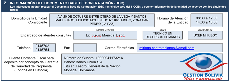 Esta parte de la convocatoria nos hace referencia a la ubicación de la entidad convocante, el servidor público encargado en atender consultas, su cargo, teléfono y correo electrónico (ante cualquier duda relacionado al Documento Base de Contratación).