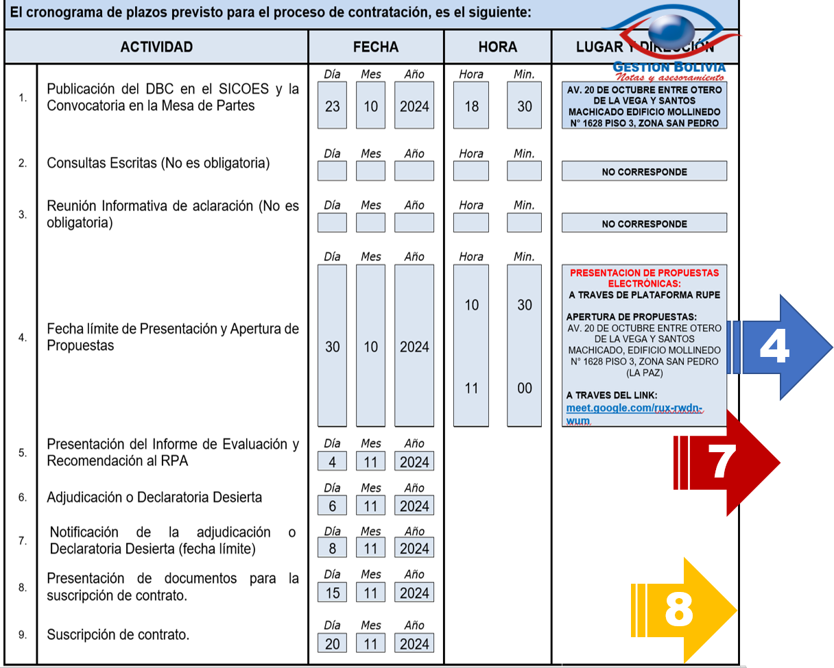 Revisa el cronograma de plazos previstos para el proceso de contratación; esta es una de las partes más importantes para la presentación de la propuesta, debiendo tomar en cuenta lo siguiente: