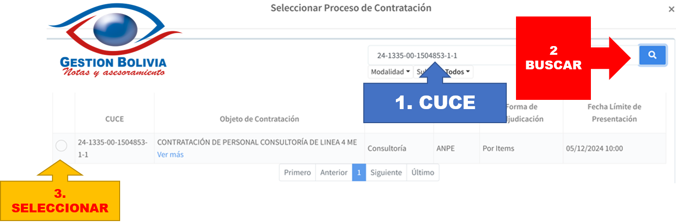 Con el número de CUCE, buscamos el proceso de nuestro interés y lo seleccionamos: