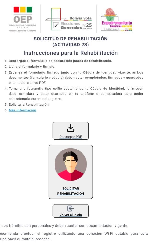 El Tribunal Supremo Electoral mediante Resolución TSE-RSP-ADM Nº 0204/2025 de fecha 3 de abril de 2025 a emitido el CALENDARIO ELECTORAL DE LA ELECCIÓN DE AUTORIDADES Y REPRESENTANTES DEL ESTADO PLURINACIONAL 2025, y cumpliendo la actividad No 23 que establece el período extraordinario de atención de solicitudes de rehabilitación de ciudadanos inhabilitados, a cargo de los Tribunales Electorales Departamentales y SE-RECI departamentales, del 19/05/2025 al 17/06/2025.